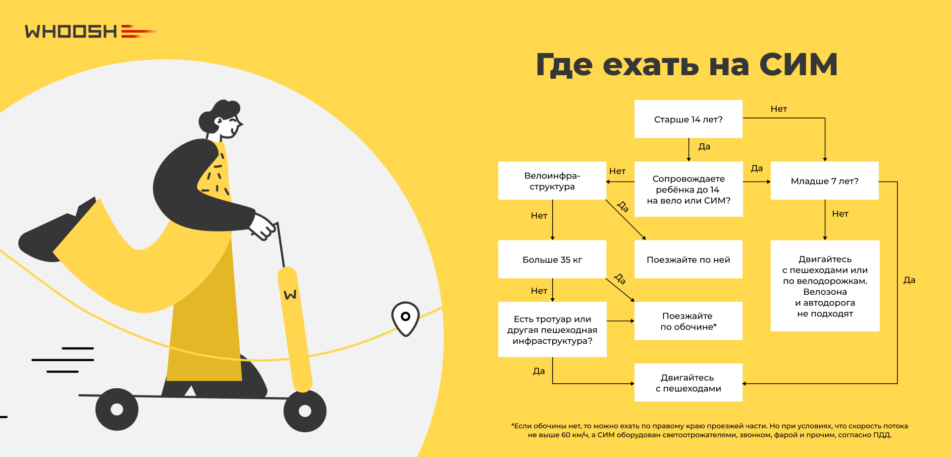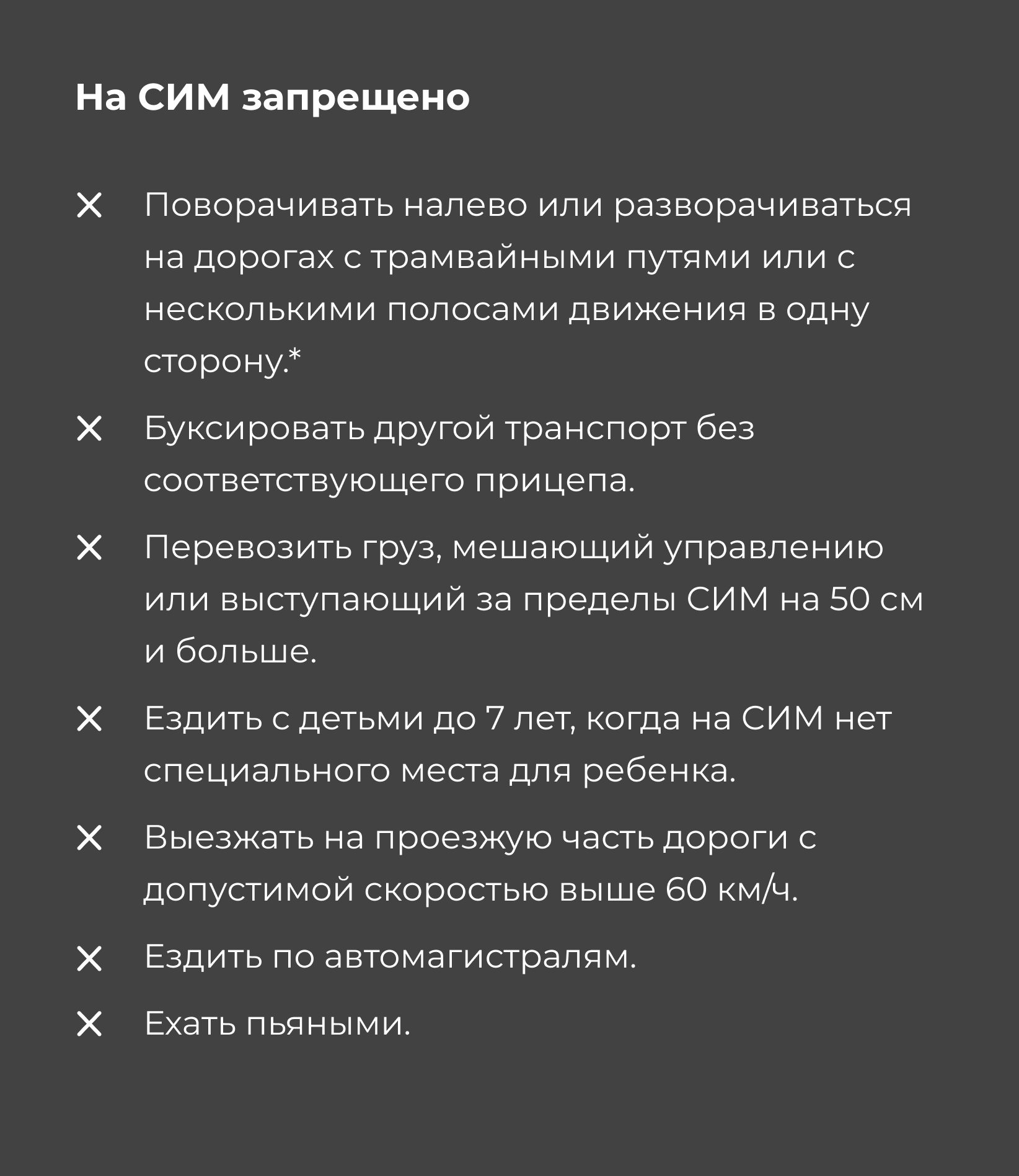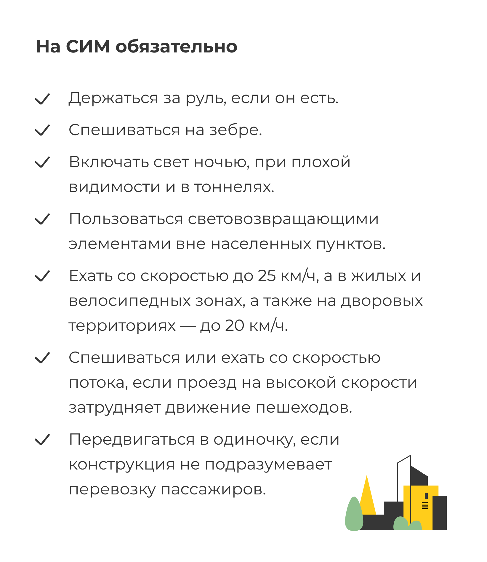 Musíte jet po kraji silnice, a pokud tam žádná není, pak na pravém okraji vozovky. Při jízdě po pravé straně je rychlost provozu na silnici do 60 km/h a SIM musí být vybavena všemi atributy vozidla dle pravidel silničního provozu (světlomet, zvonek, brzdy). jako reflektory.
